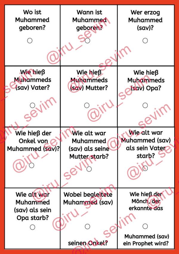 In dieser Klettmappe kommen Fragen von der Geburt Muhammeds und seinen Familienverhältnissen vor. Dabei soll die Fragenkarte auf den Platz gelegt werden. Dann sollen die Fragen mit den Antwortkarten beantwortet werden. Ist alles richtig, dann erscheint ein korrektes Bild auf dem Platz.